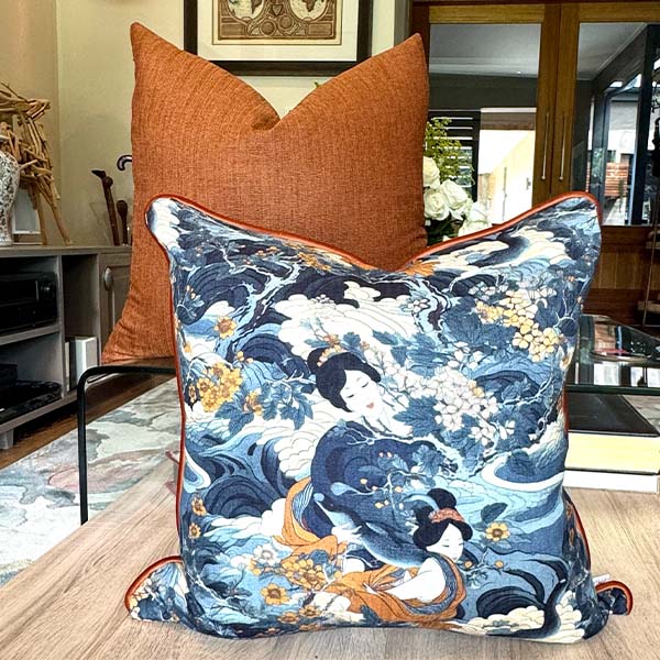 Japanese geishas form the focal point of this Eastern design that is printed on a soft viscose-linen base.