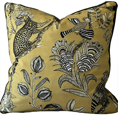 Ardmore fabric design ideal for in-house or patios. A plain upholstery yellow backside with dark grey piping to finish the scatter cover. 60cm x 60cm