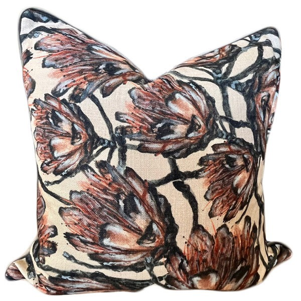 Dancing Proteas – A modern protea printed design at the front with a plain upholstery fabric at the back. Finished with grey piping and zip at the bottom. 60cm x 60cm