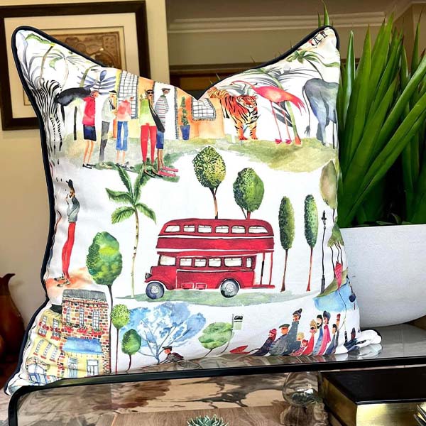 A playful uplifting and colour design. Images features people in parks, a red buss, Zoo, trees act available in 60cm x 60cm