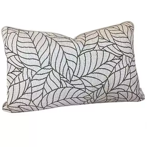 A upholstery beige fabric with green outlined leaves design. Finished with light cream piping and a concealed zip closure. 60cm x 40cm scatter cover.
