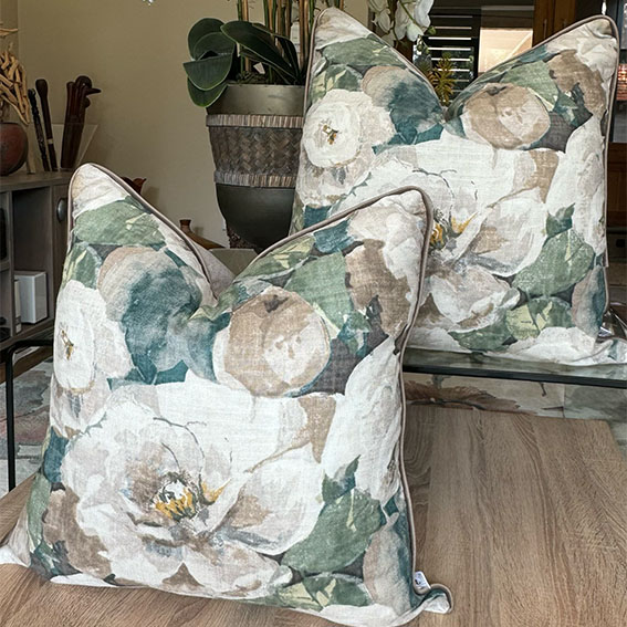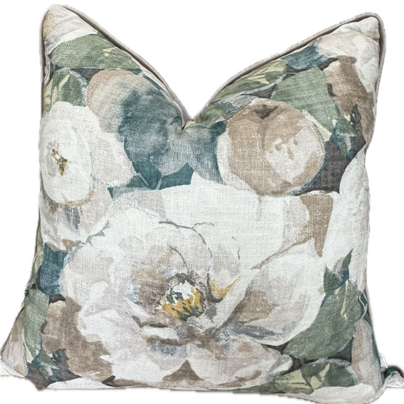 Miraculous cover has a colour combination of soft eggshell green, light creams and dark creams with a touch for sea blue. 60cm x 60cm